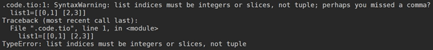 list1=[[0,1] [2,3]] #this will give a SyntaxWarning of missing comma along with the TypeError.