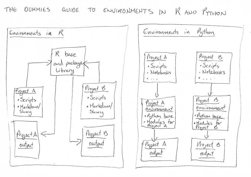 Here’s a little graphic I sketched out to explain in simple terms the difference between how environments usually work in R and Python: